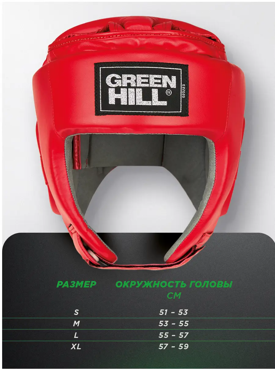 Шлем для кикбоксинга GREEN HILL одобрен Федерацией Кикбоксинга России для выступления на соревнованиях. Конструкция шлема обеспечивает максимальный обзор. Уши защищены специальными модулями для предотвращения травм барабанных перепонок. Внешняя сторона шлема выполнена из синтетических материалов, внутренняя сторона из искусственной замши. Подбородок на ремешке с липучкой. Затылок на двойном встречном замке, верх с защитой теменной области.