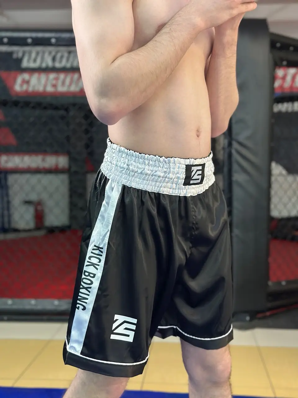Шорты для кикбоксинга выполнены из 100% полиэстера. Удобно сидят на теле и не сковывают движения. Шорты с широким белым эластичным поясом высотой 8 см. Мягкая, прочная и приятная ткань, которая способна выдержать большое количество стирок, и при этом не утратить свой внешний вид. Фиксация шорт при помощи удобной резинки и внутреннего шнурка. Подойдут для тренировок и соревнований.
